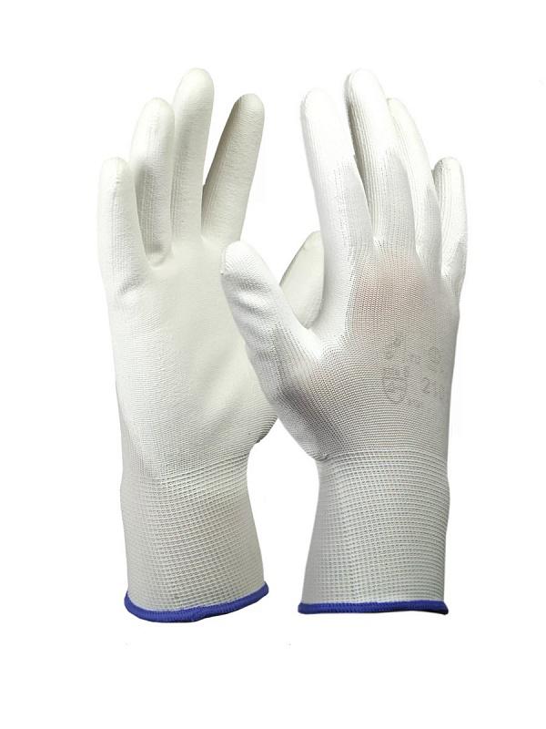 Перчатки трикотажные, нейлоновые, полуоблитые полиуретаном белого цвета на ладони и кончиках пальцев, трикотажный манжет.Основа — нейлон, 13 класс вязки, покрытие 100% полиуретан